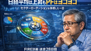 日経平均は連日で過去最高値を更新するも、我がPFは体感ほど上昇せず。含み益が増える中で利確かガチホかに悩む独身おじさんが、セクターローテーション相場を体感した一日の迷走記録です。